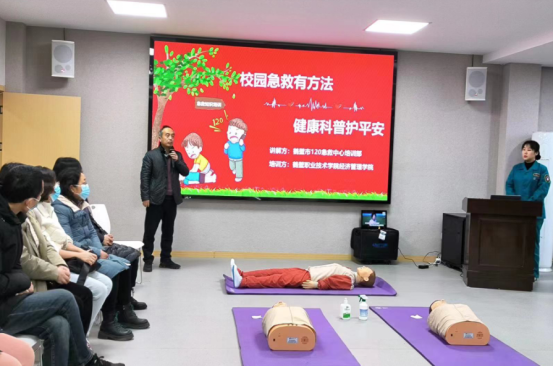 为迎接员工平安返校, 2月12日,经济管理学院联合鹤壁市120急救指挥中心开展“校园急救有方法 健康科普护平安”培训活动,学院全体教师、教辅人员、实验室管理员参加。