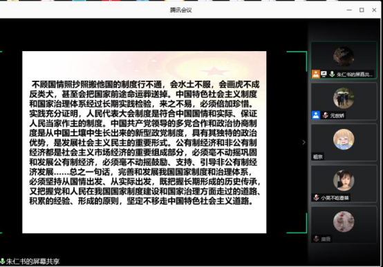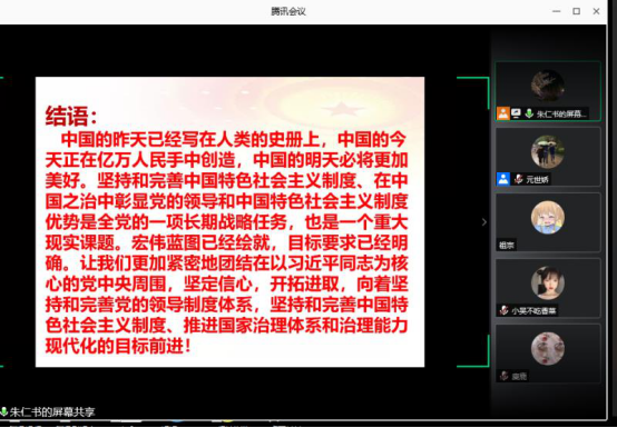 6月22日下午,党总支书记朱仁书以视频形式通过腾讯会议讲授题为“在中国之治中彰显党的领导和社会主义制度优势”党课。经济管理新版UED官网党总支全体党员、发展对象及入党积极分子参加。
