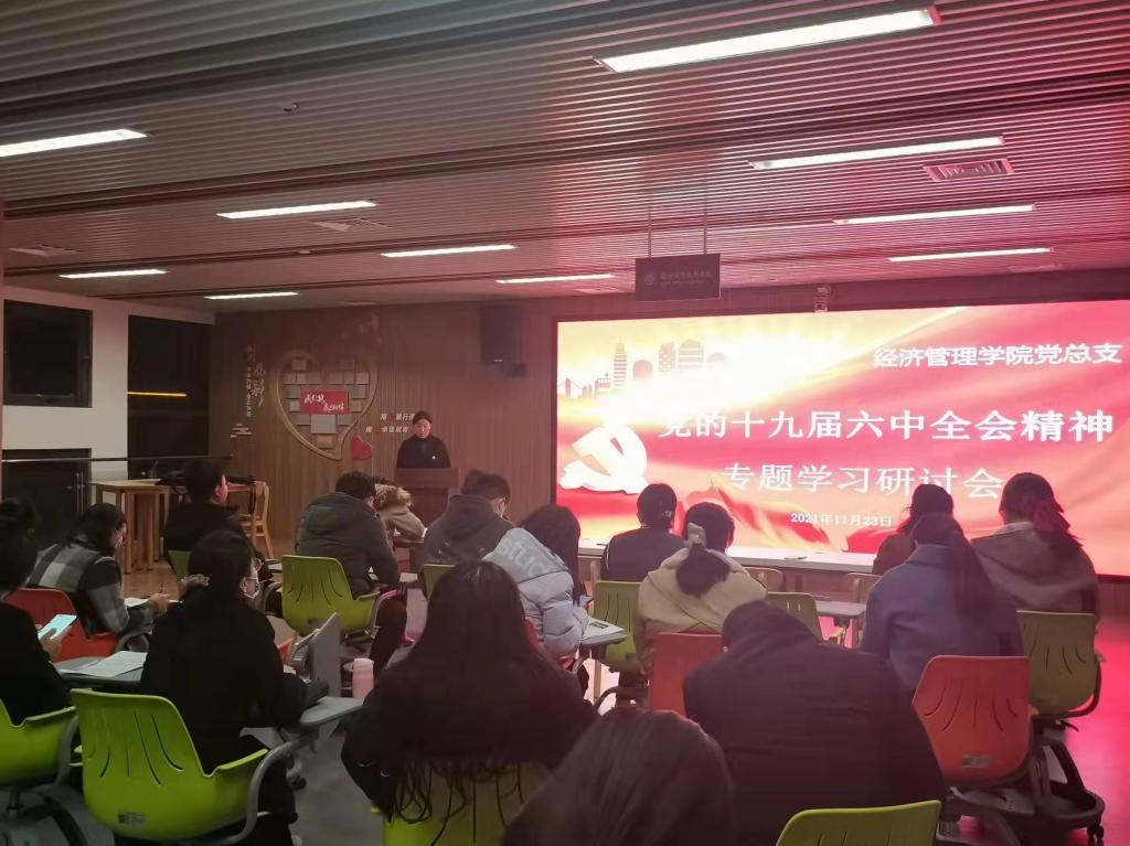 11月23日下午,经济管理学院在海棠园校区“讲习”中心、教师发展中心组织召开党总支理论学习中心组学习(扩大)会议,学习贯彻党的十九届六中全会精神暨省第十一次党代会精神。