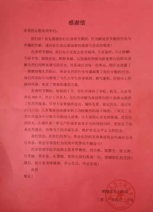 近日,经济管理学院收到鹤壁市烈士陵园送来的感谢信,全文如下: