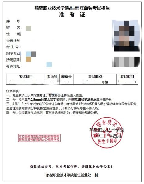 4月24日12时后考生登录单招服务平台查看考场安排并自行打印单招考试准考证。单招考试准考证丢失的考生可持身份证到人才招聘处补打印。