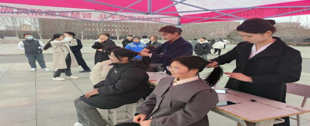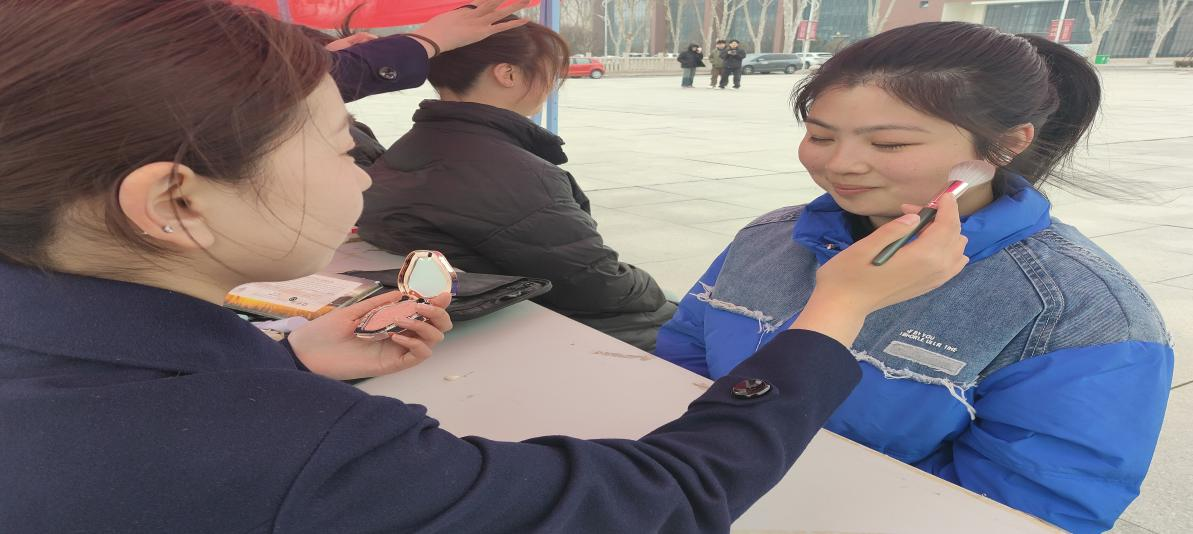下午,在海棠园校区知行广场,一群身着统一制服的员工手持化妆和盘发工具,面带温暖的微笑,为同学们提供免费的化妆和盘发服务。她们是来自空中乘务和高速铁路客运服务专业的员工,运用自己的专业技能,不仅提升了同学们的外在形象,更帮助她们展现了内在的魅力和自信。
