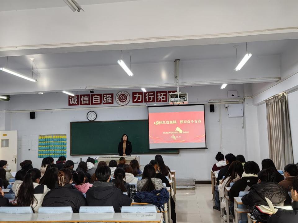 11月29日,经济管理新版UED官网党总支纪检委员、副经理陈保霞以“赓续红色血脉,照亮奋斗青春”为主题,结合自身湖南培训学习经历,以中共湘区的峥嵘历史,通过一个个鲜活的党史故事,从“战火中奋斗的青春”、“红旗下不朽的先烈”、“传承路、有为的成长”三个方面,为经济管理学院入党积极分子上了一节有料、有感、有效的生动党课。她希望全体入党积极分子要进一步坚定信仰,争做先进,将红色精神融入日常生活和实践中。
