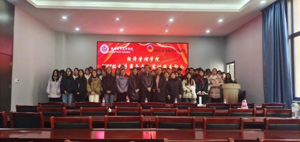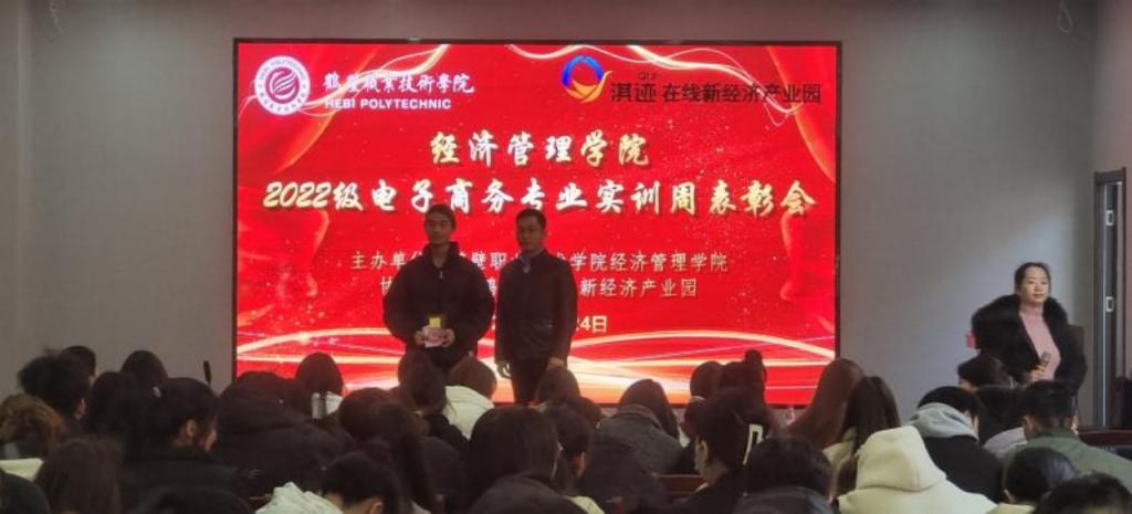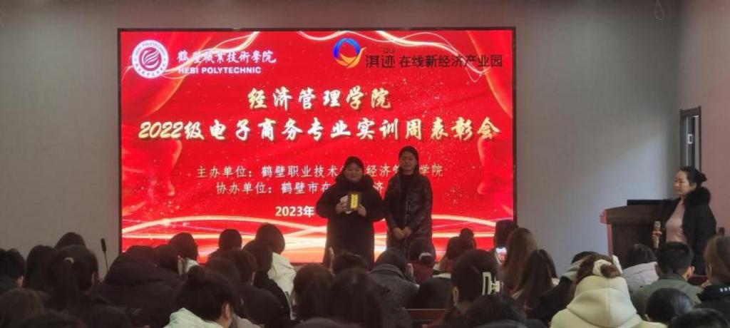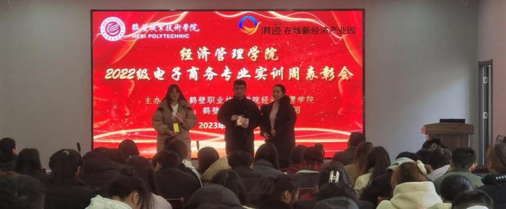 11月6日-11月24日,经济管理学院与鹤壁市淇迹数字有限公司积极探索产教融合新模式,开展了电商直播实训周,24日上午,实训周总结暨表彰大会圆满举行,企业领导、校方领导、指导老师及22级电商专业全体员工参加会议。会议由教研室主任韩颖丽主持。