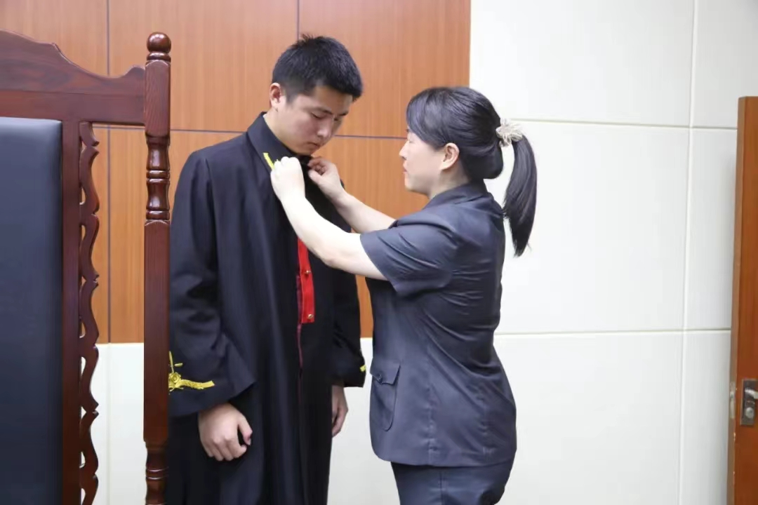 活动中,在法院干警的引领下,员工们实地参观了14号审判庭。参观过程中,法院干警向员工们讲解了法院近几年的智慧法院建设成果,向员工们展示了法庭的组成及审理过程。讲解完成后,员工们经过简短准备和演练,现场穿起法袍,开展模拟法庭活动。