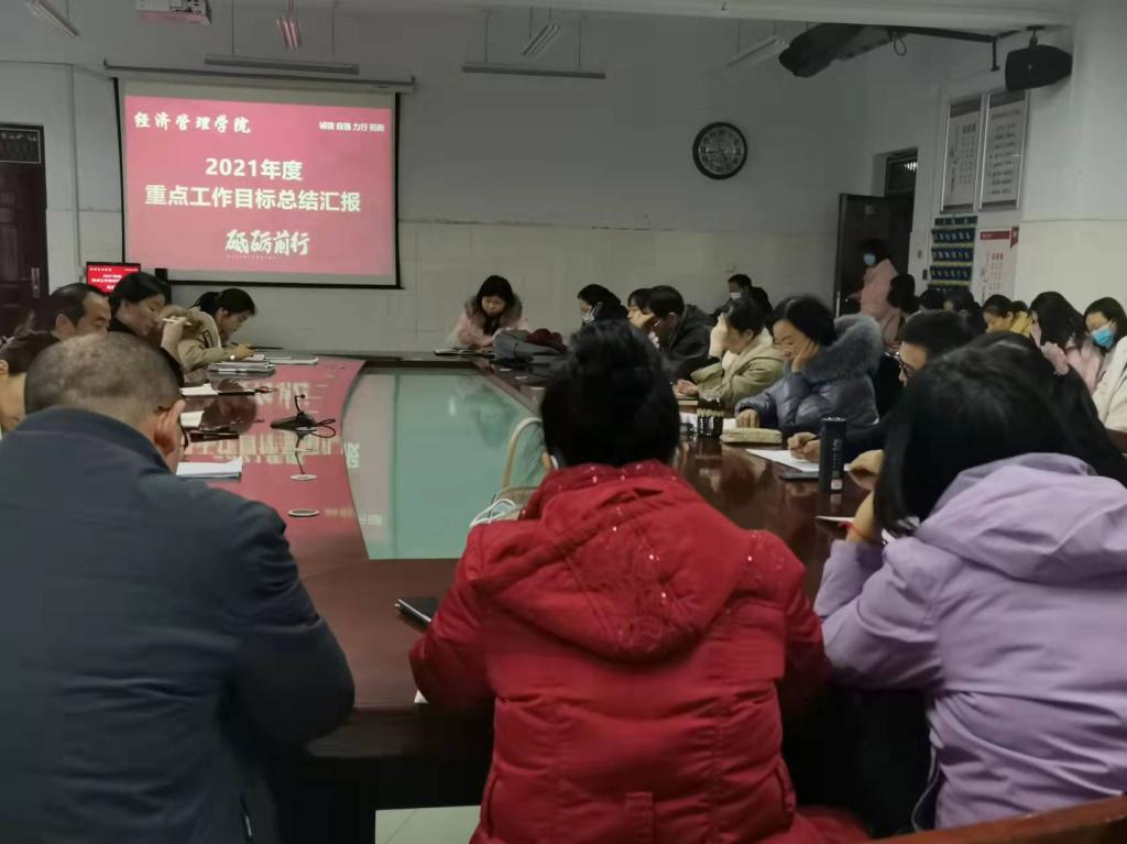 12月29日,经济管理学院召开全体教职工会议,根据年初与各办公室及各教研室签订的目标责任书,由各办公室负责人和教研室主任对2021年重点工作目标完成情况进行总结汇报,梳理本年度取得的工作成绩以及存在的不足,从而积累经验,凝心聚力再出发!