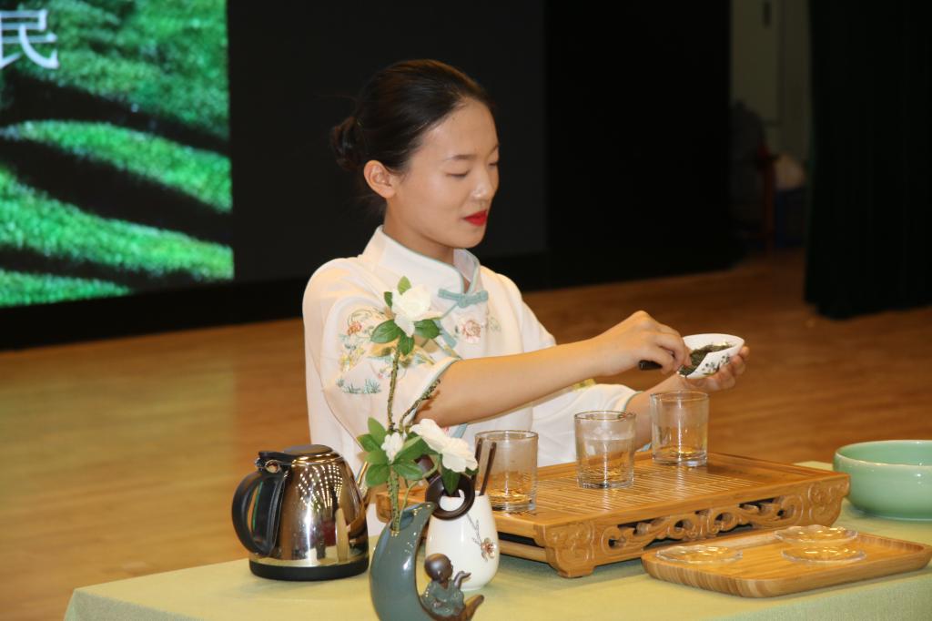 在既定茶艺、理论问答、创新茶艺和茶汤质量比拼四个比赛环节中,最吸引眼球的当属创新茶艺环节。孙雪洋以乡村振兴为背景,发挥乡村特色农业优势,为信阳毛尖做直播带货,以此作为创意主题;郭冰琦以自己所学空乘专业为背景,白茶为载体,向最美逆行者——抗议英雄致敬;杨森以“敬奉香茗红心向党”为主题,在中国共产党成立100周年之际,借此机会向党敬一杯茶,表达对党的感谢之情。