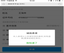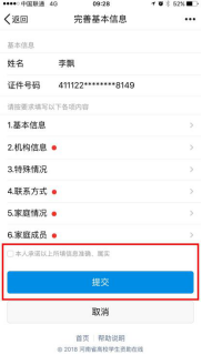 以上信息填写完毕,点选承诺书前方框,点击“提交”,系统会以绿色字体在页面正上方提示正在保存, 请注意不要多次点击“提交”。