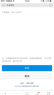 5、各项申请理由中均不允许有空格、空行、英文特殊字符,如保存时页面上方未显示绿色保存字样,则需要认真检查申请理由中是否存在如上问题。推荐使用讯飞语音输入法APP 录入申请理由,或使用电脑端将申请理由发至手机端进行粘贴。